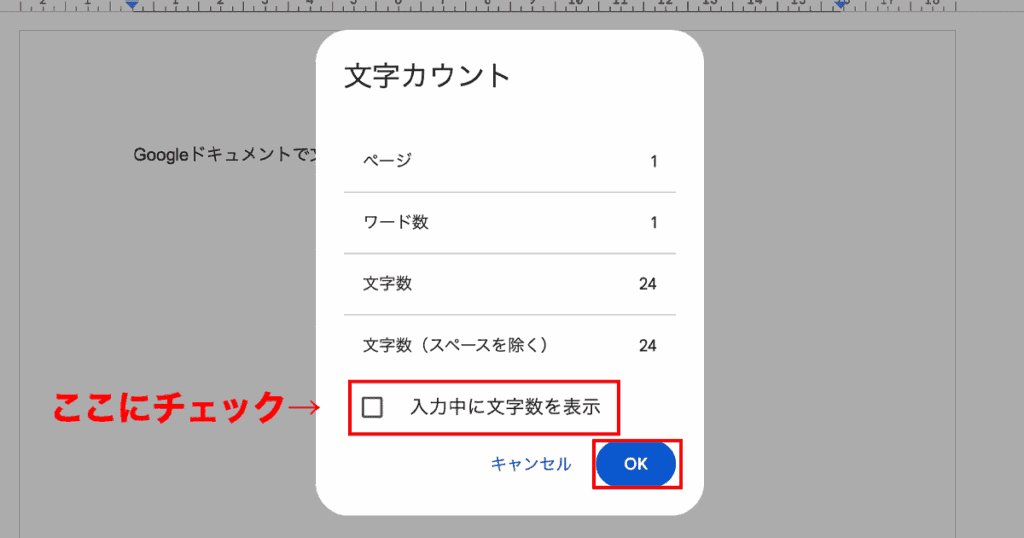 - 文字カウントボックス内にある「入力中の文字数を表示」にチェックを入れ、「OK」をクリックして完了
