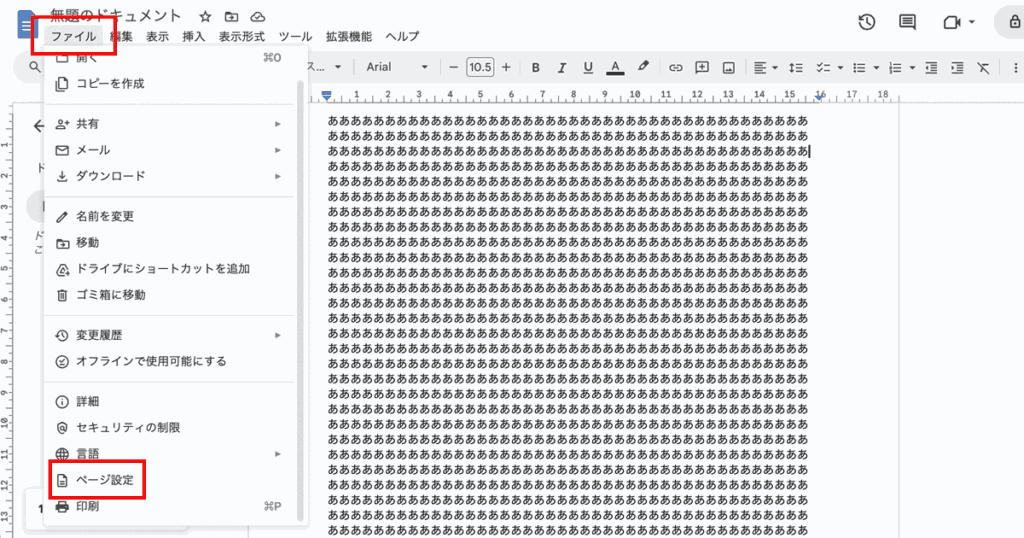 - ファイルメニューの「ファイル」→「ページ設定」の順にクリック