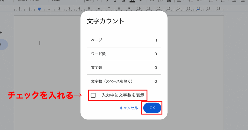 - 「入力中に文字数を表示」にチェックを入れ「OK」をクリック