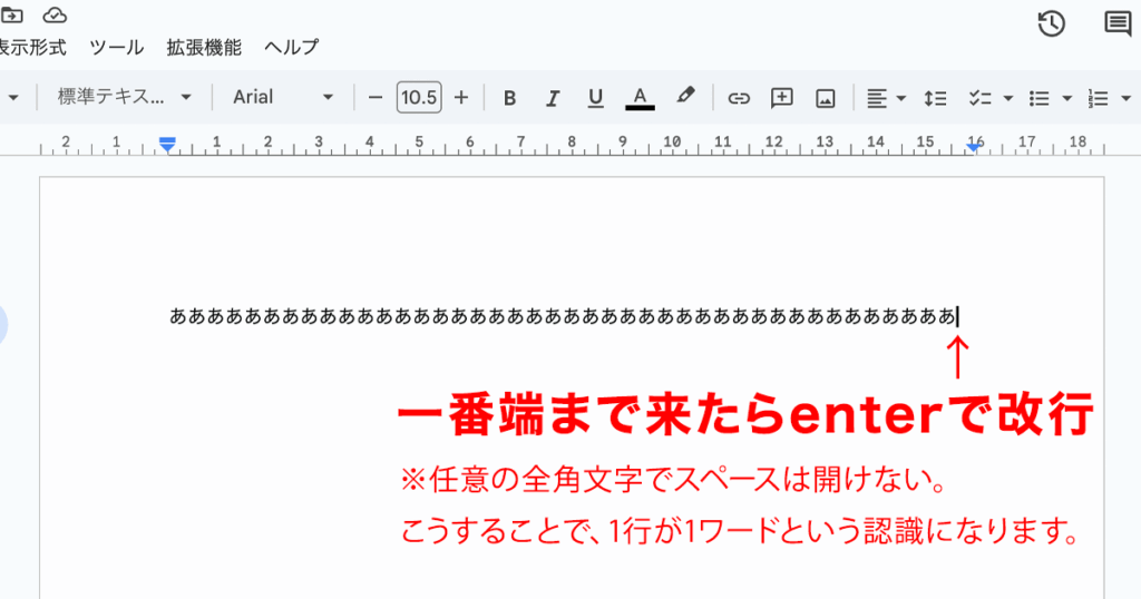 - 任意の文字を横幅ギリギリまで入力し、一番端まで来たら改行
