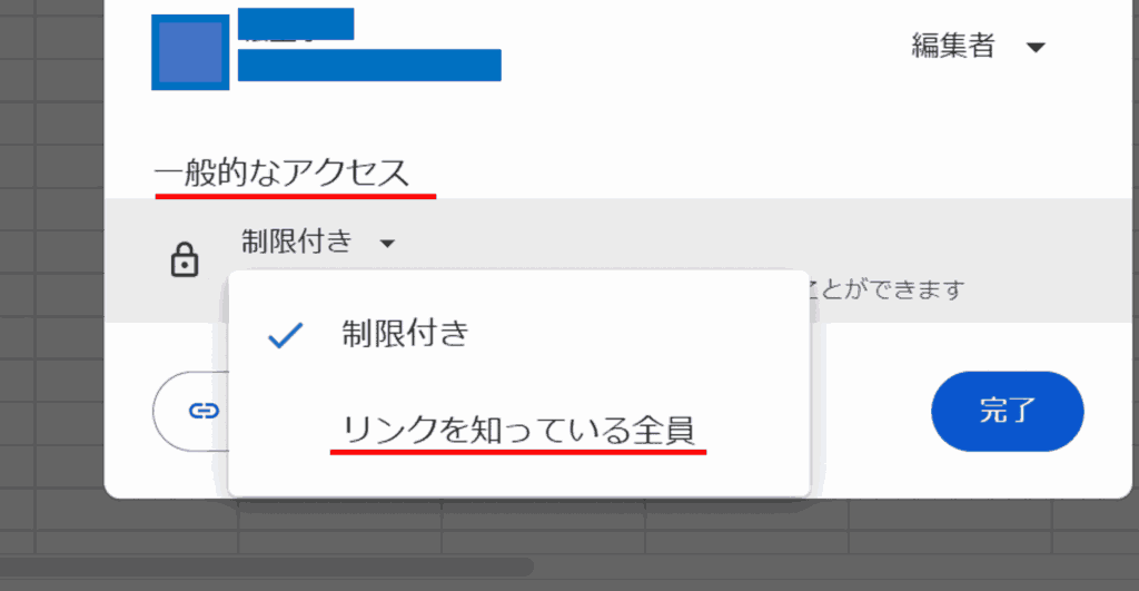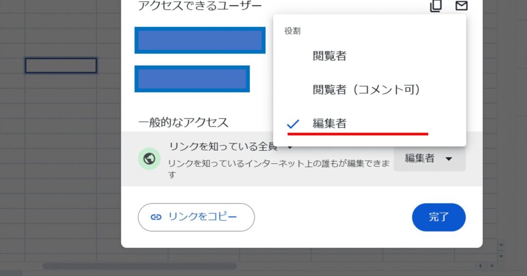 - シート右上の「共有」から「一般的なアクセス」を変更し、役割を「編集者」に設定